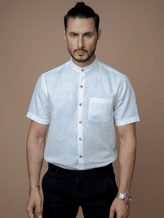 Formal Half Sleeves Linen Shirt With Mandarin Collar