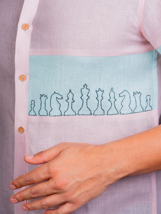 Linen Half Sleeves Shirt With Hand Embroidery On Colour Block