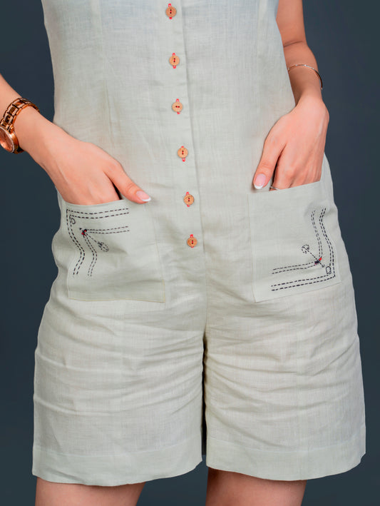 Linen Sleeveless Play Suit With Hand Embroidered Patch Pocket