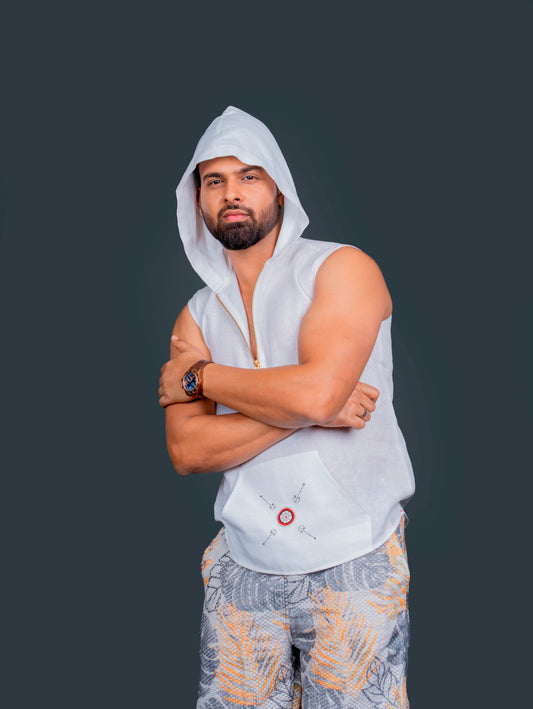 Linen Sleeveless Hoodie With Hand Embroidery On Kangaroo Pocket